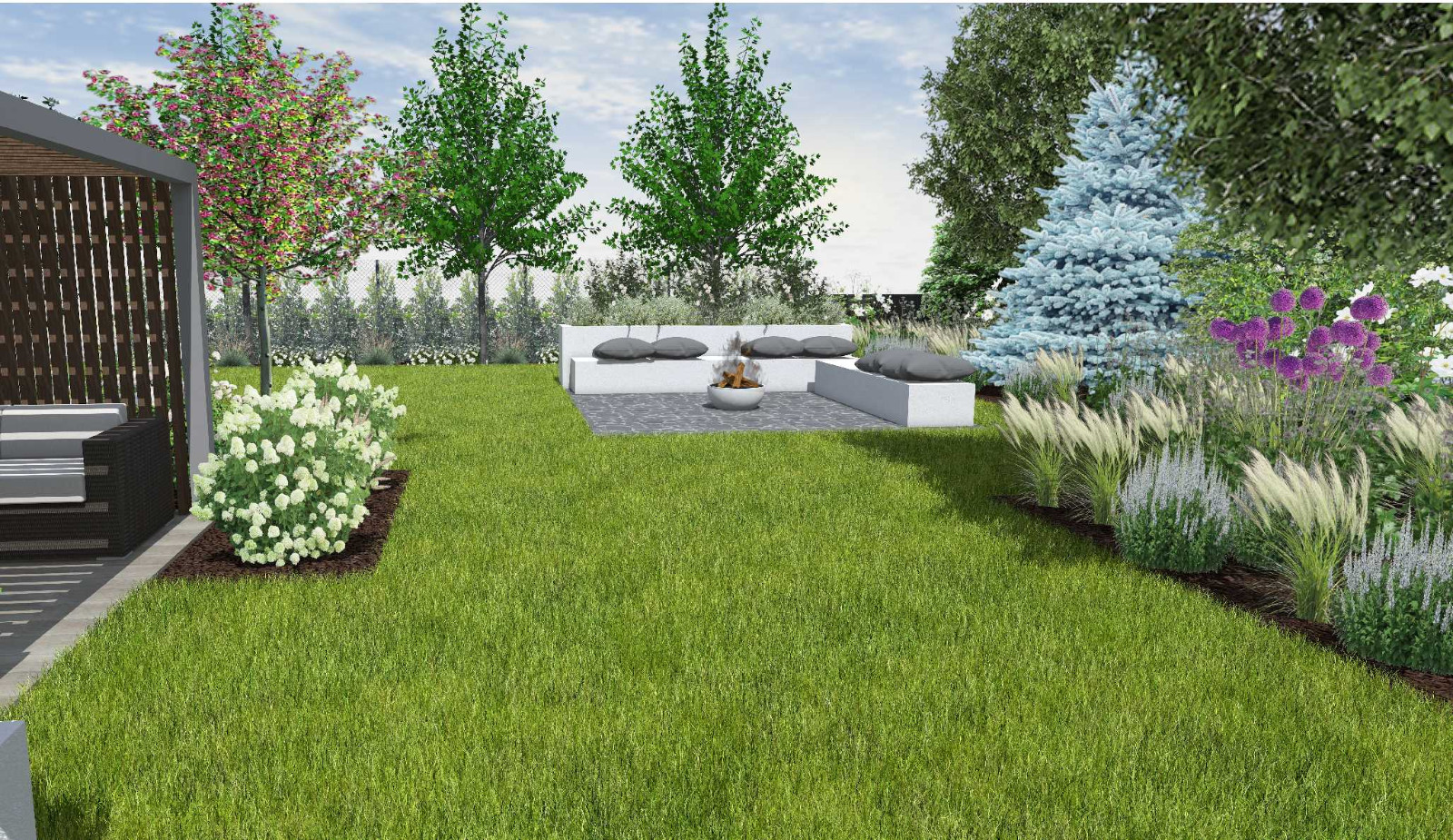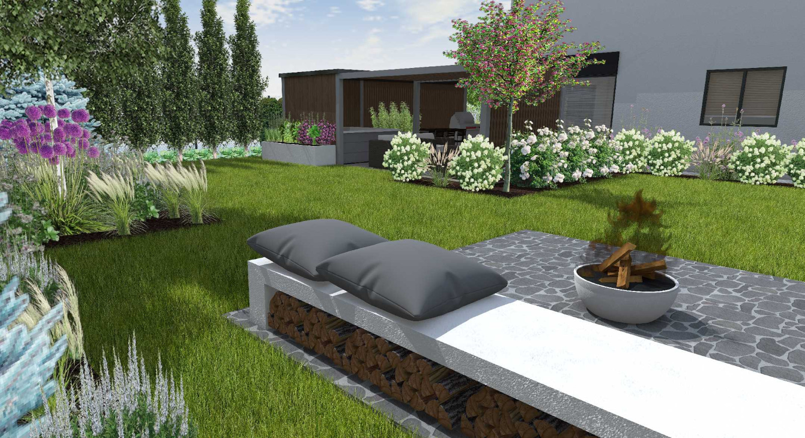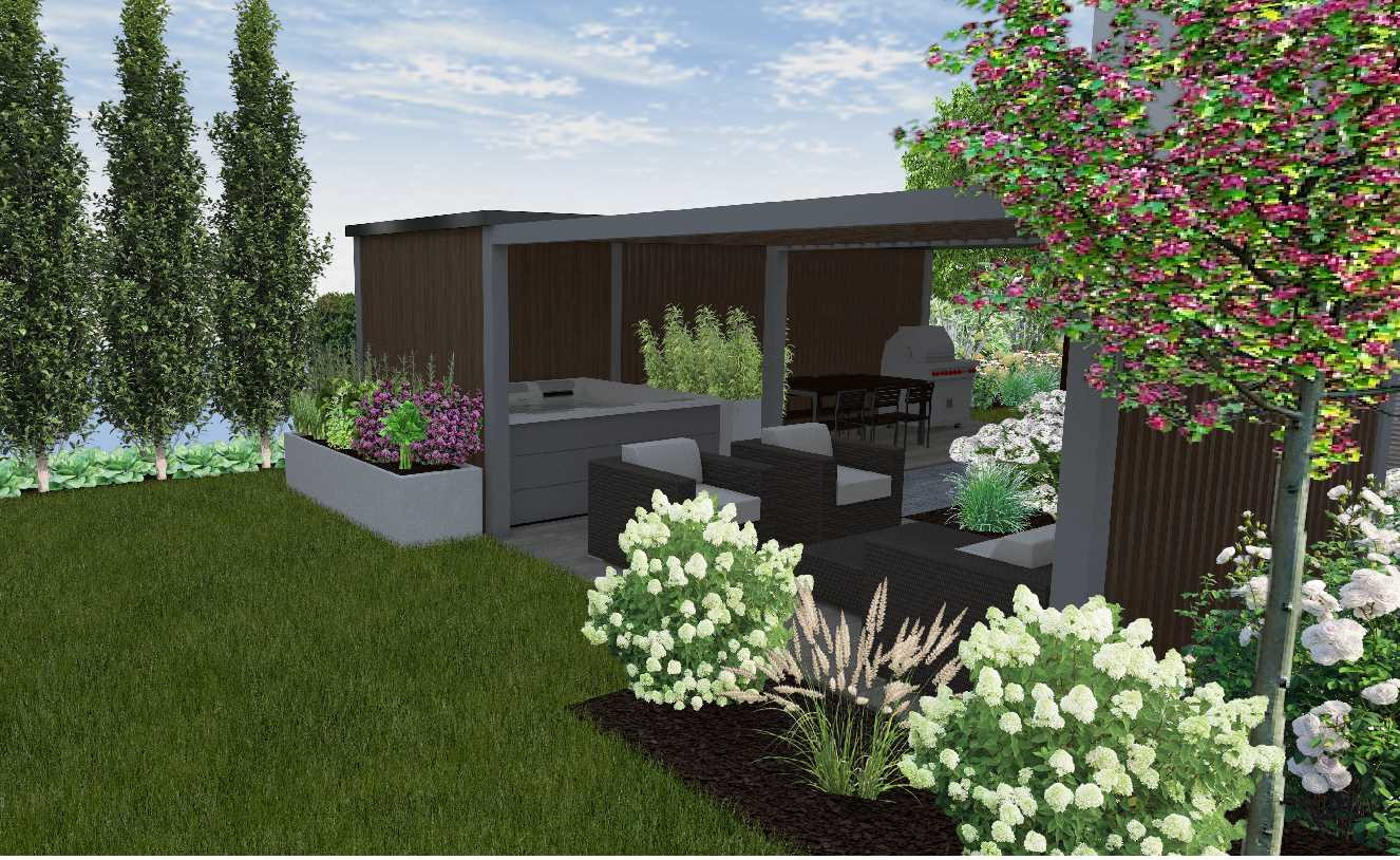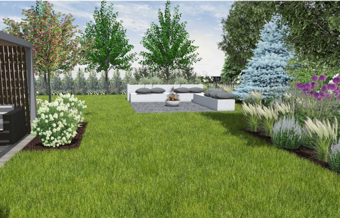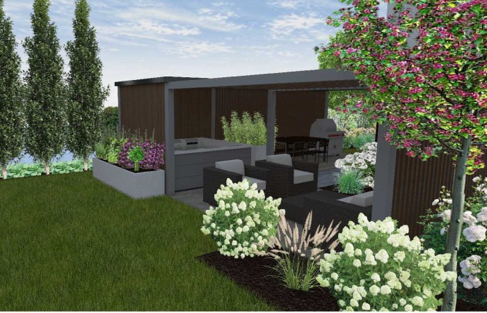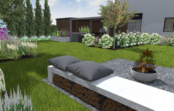 Na tej niespełna 600 metrowej działce właściciele chcieli zmieścić sporo funkcji. Budynek gospodarczy, dużą altanę, palenisko, donice z ozdobnymi nasadzeniami, spory trawnik i dużo roślin ozdobnych na rabatach. I wszystkie te oczekiwania zostały spełnione, a w obszernej altanie znalazły miejsce meble wypoczynkowe, meble jadalniane, grill, donica na rośliny całoroczne oraz jacuzzi. Dodatkowo donice zostały zaplanowane przed wejściem do domu, w okolicy paleniska, a także donica na zioła w pobliżu altany. Rośliny w całym ogrodzie zostały dobrane pod kątem maksymalnie bezobsługowym.
