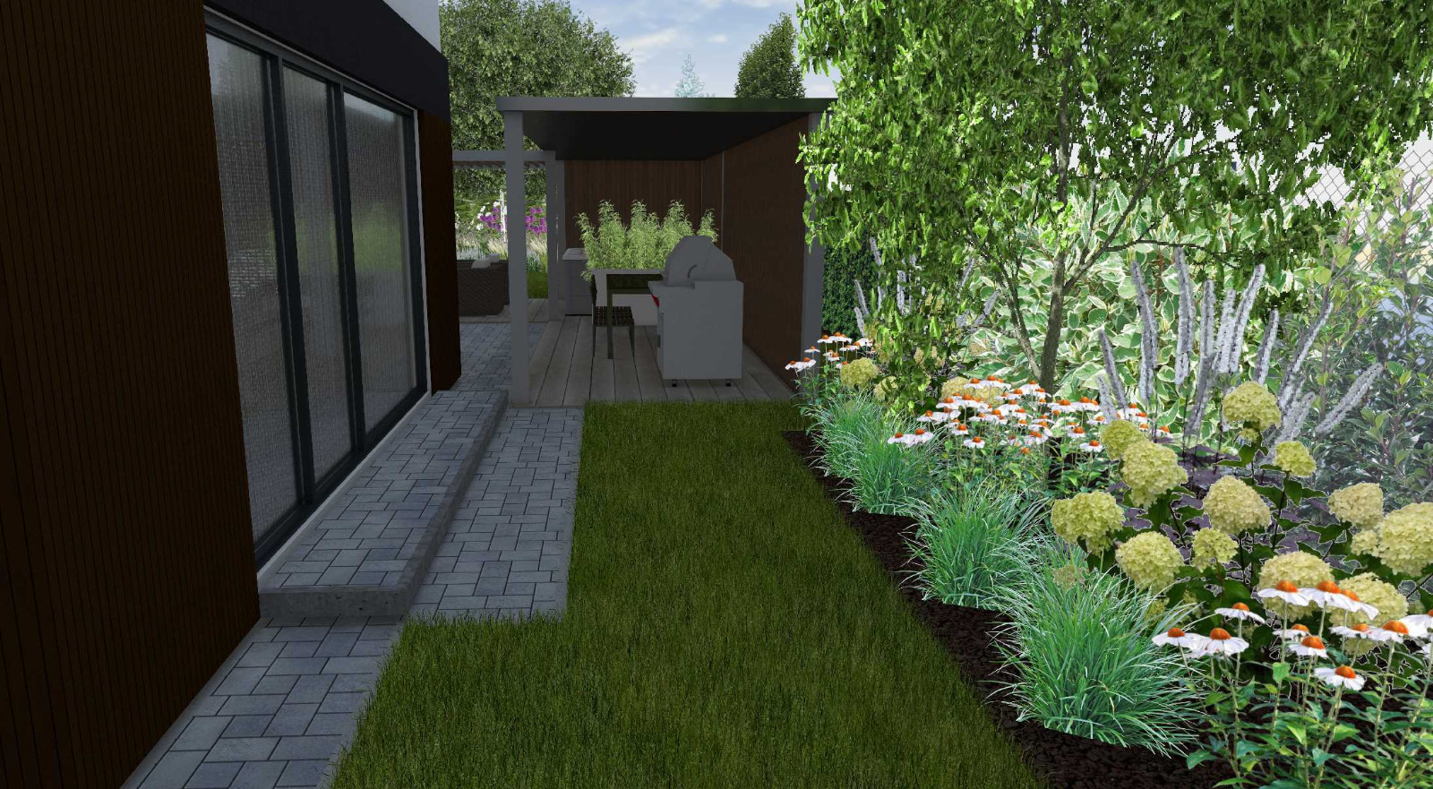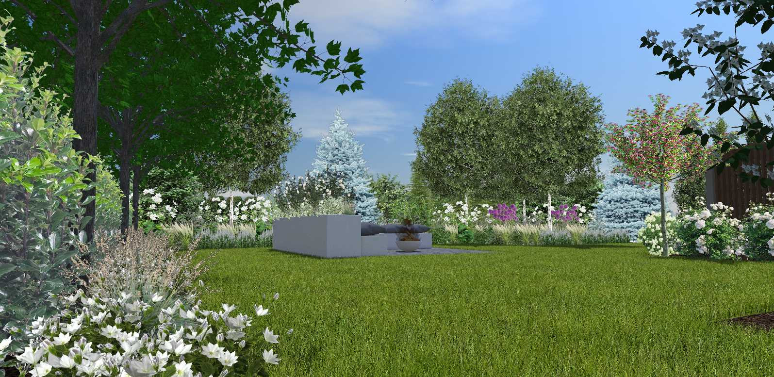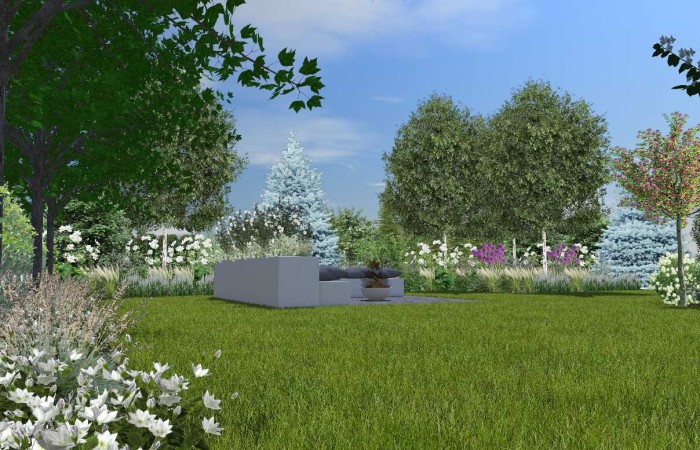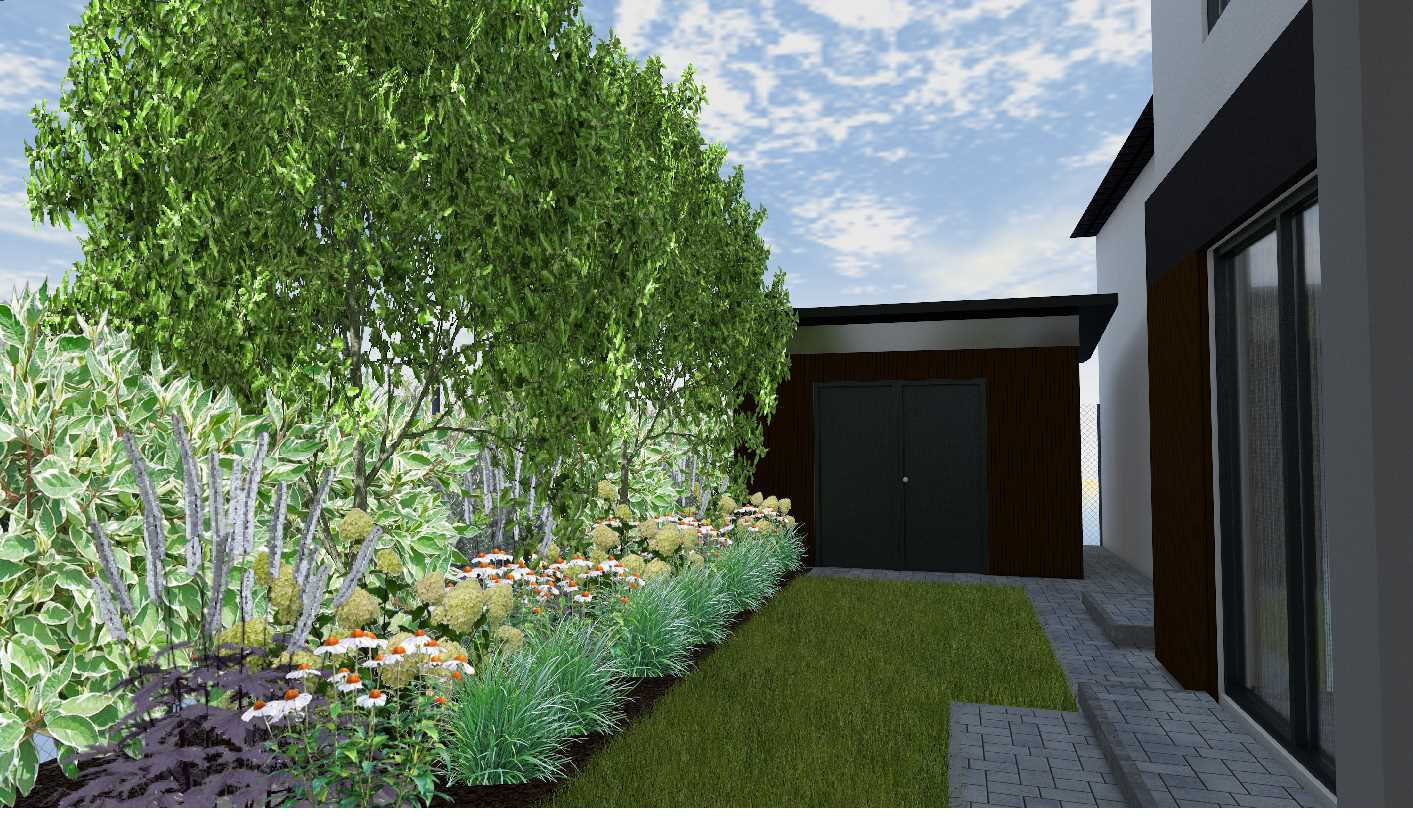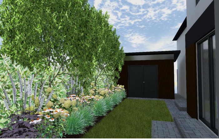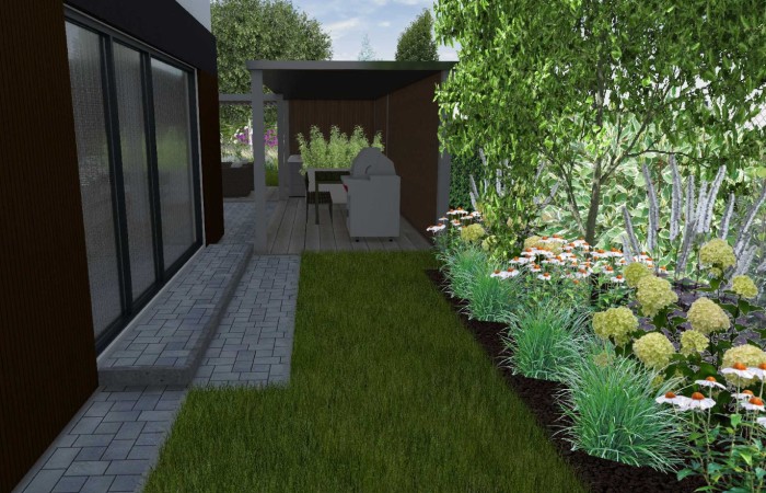 Na tej niespełna 600 metrowej działce właściciele chcieli zmieścić sporo funkcji. Budynek gospodarczy, dużą altanę, palenisko, donice z ozdobnymi nasadzeniami, spory trawnik i dużo roślin ozdobnych na rabatach. I wszystkie te oczekiwania zostały spełnione, a w obszernej altanie znalazły miejsce meble wypoczynkowe, meble jadalniane, grill, donica na rośliny całoroczne oraz jacuzzi. Dodatkowo donice zostały zaplanowane przed wejściem do domu, w okolicy paleniska, a także donica na zioła w pobliżu altany. Rośliny w całym ogrodzie zostały dobrane pod kątem maksymalnie bezobsługowym.